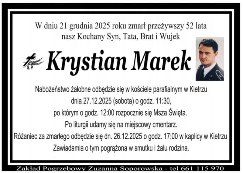 W dniu 21 grudnia 2025 roku - po długiej i ciężkiej chorobie zmarł Krystian Marek.