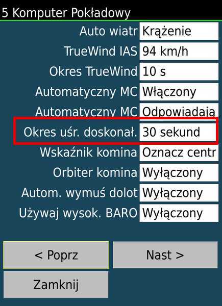 Ważne - czas uśredniania pomiarów może być przez użytkownika samodzielnie ustawiony. Nie tworzyłem tu nowego parametru - ale wykorzystałem istniejący parametr konfiguracyjny Okres uśredniania doskonałości. Przy wyborze wartości należy się sugerować właściwościami statku powietrznego (jak szybko lata) i charakterystyką zmienności prędkości. Im szybciej latamy - tym czas powinien być krótszy. Im bardziej prędkość fluktuuje w czasie - tym czas powinien być dłuższy. Przy lotach motolotnią i prędkością przelotową ~100km/h - mam ten parametr ustawiony na 30 sekund. Czyli LK będzie wyliczało moją średnią prędkość z ostatnich 30 sekund i na jej podstawie zostanie wyświetlona AvgGS, NxAvETA, NxAvETA.
