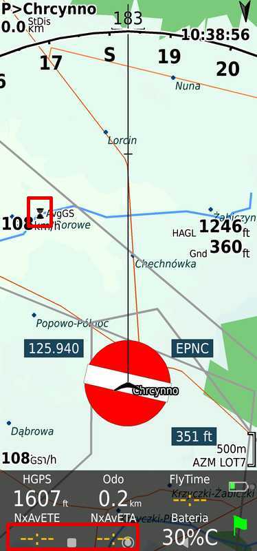 Prędkość uśredniana do obliczenia nowych parametrów wymaga zebrania pomiarów co najmniej przez ustawiony czas. Tak więc - w moim ustawieniu - nowe parametry zostaną wyliczone dopiero po co najmniej 30 sekundach lotu. Z tego powodu - w pierwszym okresie lotu - dane nie będą wyświetlane (dla NxAvETE/NxAvETA), a jako AvgGS - będzie wyświetlana prędkość chwilowa i mała klepsydra oznaczająca oczekiwanie na wypełnienie bufora. Taką sytuację pokazuje poniższy zrzut ekranu.